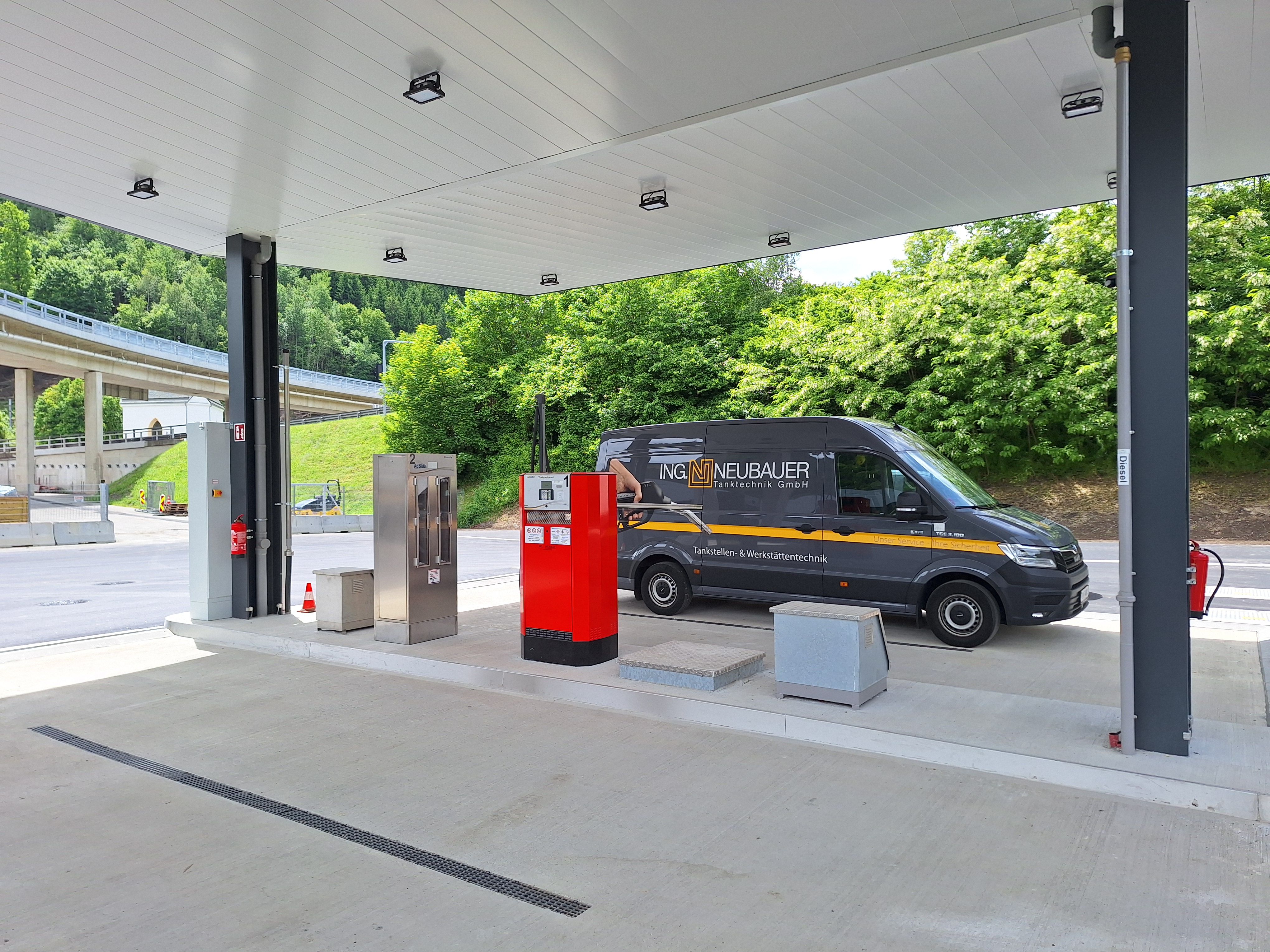Im Rahmen umfassender Sanierungsmaßnahmen wurde die bestehende Tankanlage an die aktuellen Anforderungen angepasst und vollständig erneuert. Die neue Anlage ermöglicht eine komfortable Betankung von LKW und PKW mit Diesel und AdBlue.